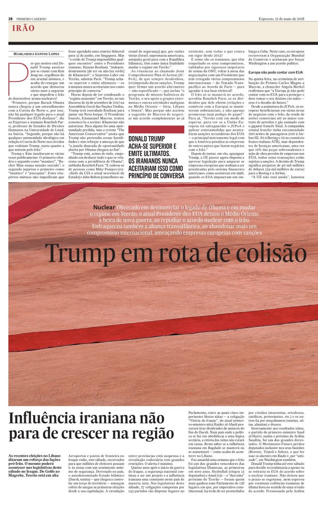 Donald Trump tinha até este sábado para decidir se continuaria a apoiar ou se retiraria os EUA do acordo sobre o nuclear iraniano. Não deixou que o prazo se esgotasse, nem esperou por eventuais cedências iranianas de última hora no sentido de uma revisão do acordo. Pressionado pela Arábia Saudita (que tem no Irão o grande rival) e por Israel (que tem fronteira com o Líbano e vive em alerta permanente em relação às movimentações do Hezbollah), Trump cortou a eito. Os resultados eleitorais no Líbano podem ter sido a provocação final à sua conhecida impaciência.