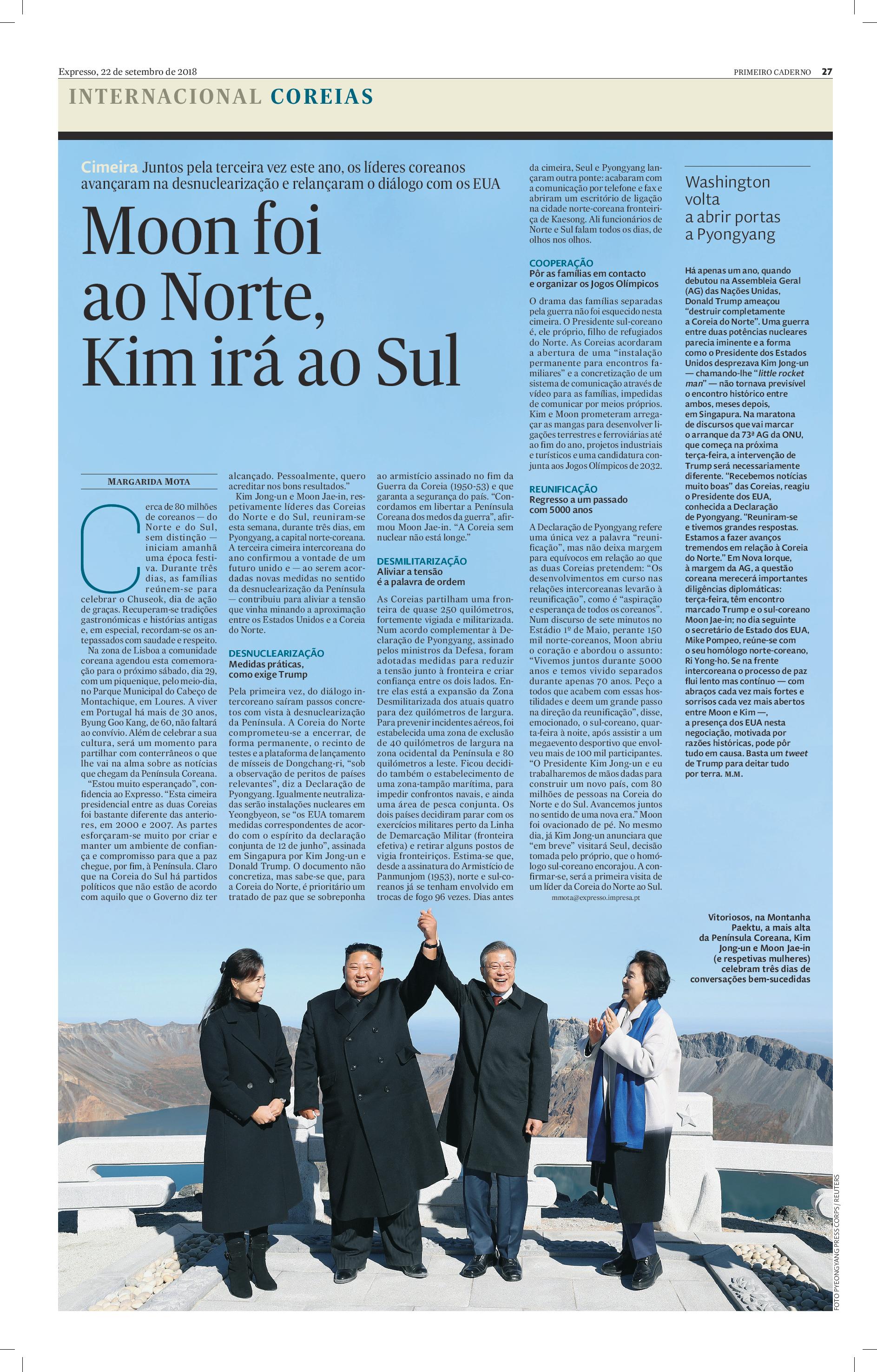 Kim Jong-un e Moon Jae-in, respetivamente líderes das Coreias do Norte e do Sul, reuniram-se esta semana, durante três dias, em Pyongyang, a capital norte-coreana. A terceira cimeira intercoreana do ano confirmou a vontade de um futuro unido e — ao serem acordadas novas medidas no sentido da desnuclearização da Península — contribuiu para aliviar a tensão que vinha minando a aproximação entre os Estados Unidos e a Coreia do Norte.