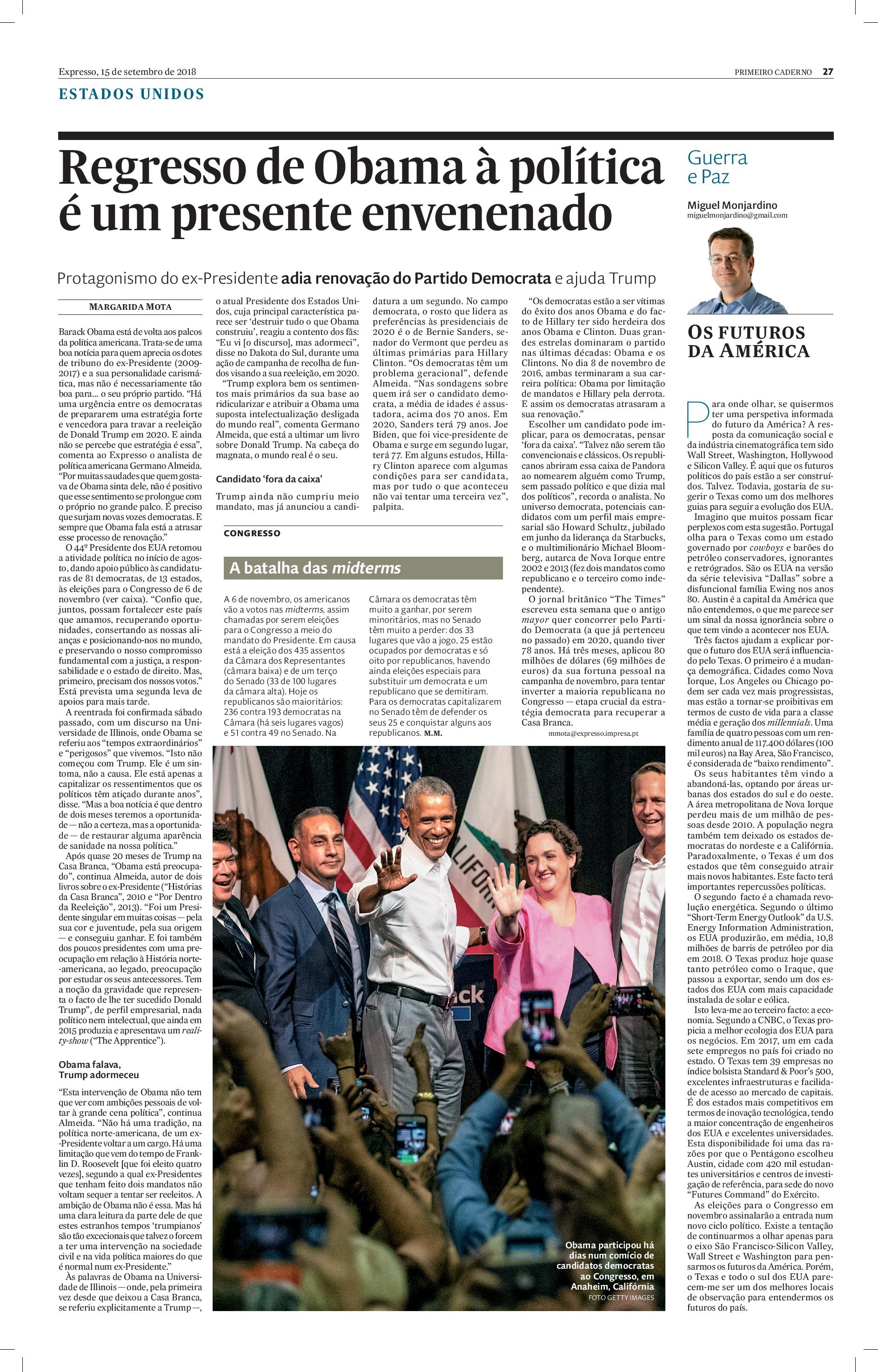 O 44º Presidente dos EUA retomou a atividade política no início de agosto, dando apoio público às candidaturas de 81 democratas, de 13 estados, às eleições para o Congresso de 6 de novembro (ver caixa). “Confio que, juntos, possam fortalecer este país que amamos, recuperando oportunidades, consertando as nossas alianças e posicionando-nos no mundo, e preservando o nosso compromisso fundamental com a justiça, a responsabilidade e o estado de direito. Mas, primeiro, precisam dos nossos votos.” Está prevista uma segunda leva de apoios para mais tarde.
