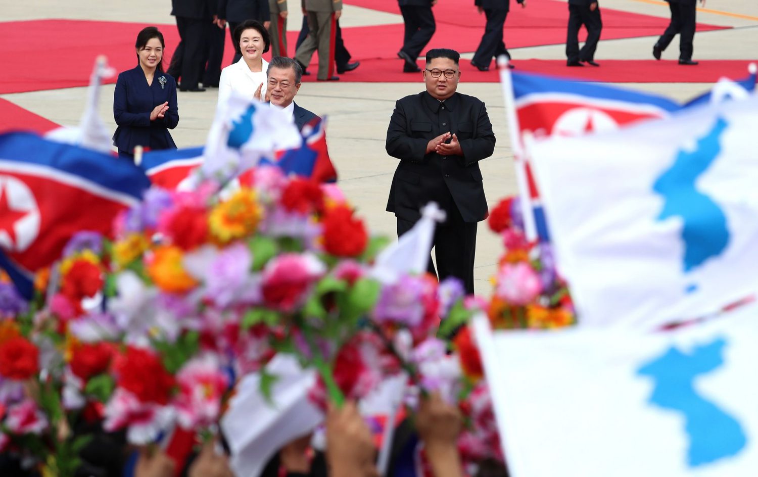Esta terça-feira, à chegada a Pyongyang, cerca das 9h50 da manhã (mais oito horas do que em Portugal Continental), Moon Jae-in tinha o seu homólogo à espera, na pista do Aeroporto Internacional de Sunan. Ultrapassados os cerimoniais militares, entraram num Mercedes preto e, com os corpos de fora do tejadilho, desfilaram por Pyongyang, saudados nas bermas por milhares de pessoas sorridentes, vestidas com trajes coloridos, acenando com bandeiras da Coreia do Norte e da Coreia Unificada. Pelas 3h45 da tarde, começaram as conversações formais, que continuarão na quarta-feira.