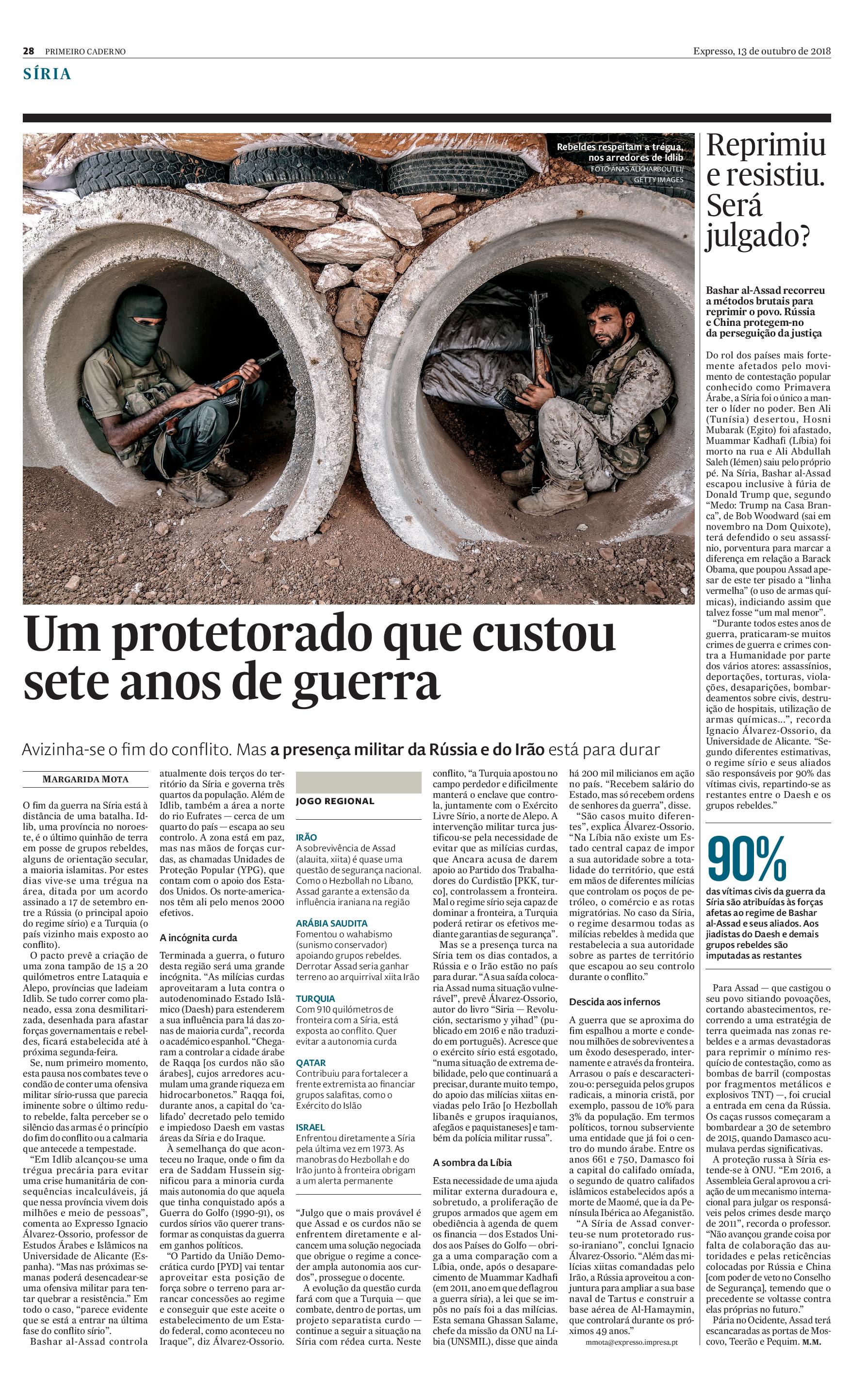 “Em Idlib alcançou-se uma trégua precária para evitar uma crise humanitária de consequências incalculáveis, já que nessa província vivem dois milhões e meio de pessoas”, comenta ao Expresso Ignacio Álvarez-Ossorio, professor de Estudos Árabes e Islâmicos na Universidade de Alicante (Espanha). “Mas nas próximas semanas poderá desencadear-se uma ofensiva militar para tentar quebrar a resistência.” Em todo o caso, “parece evidente que se está a entrar na última fase do conflito sírio”.