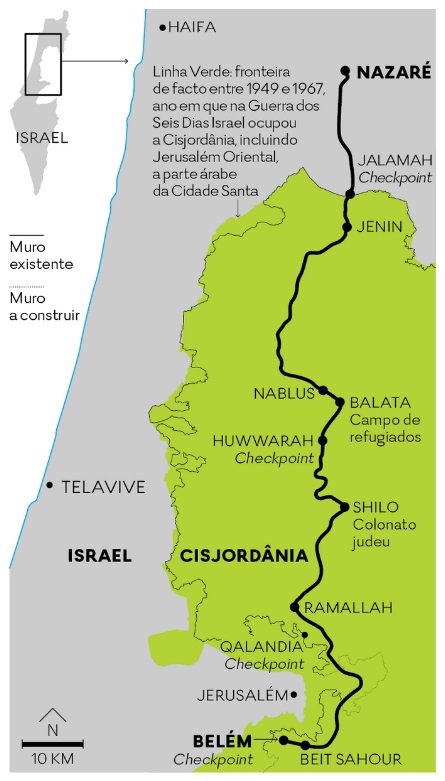 Cerca de 20 quilómetros para sul de Nazaré, o checkpoint de Jalamah assinala a fronteira entre Israel e o território palestiniano ocupado da Cisjordânia. Junto ao este posto de controlo, ergue-se o muro — a que Israel chama “vedação de segurança” — que, ora em betão ora em arame, vai contornando o território palestiniano.