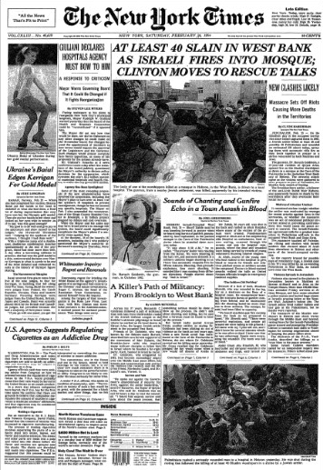 (Foto: Capa da edição de 26 de fevereiro de 1994 do jornal norte-americano “The New York Times”, em que noticia o massacre de Hebron ARQUIVO THE NEW YORK TIMES)