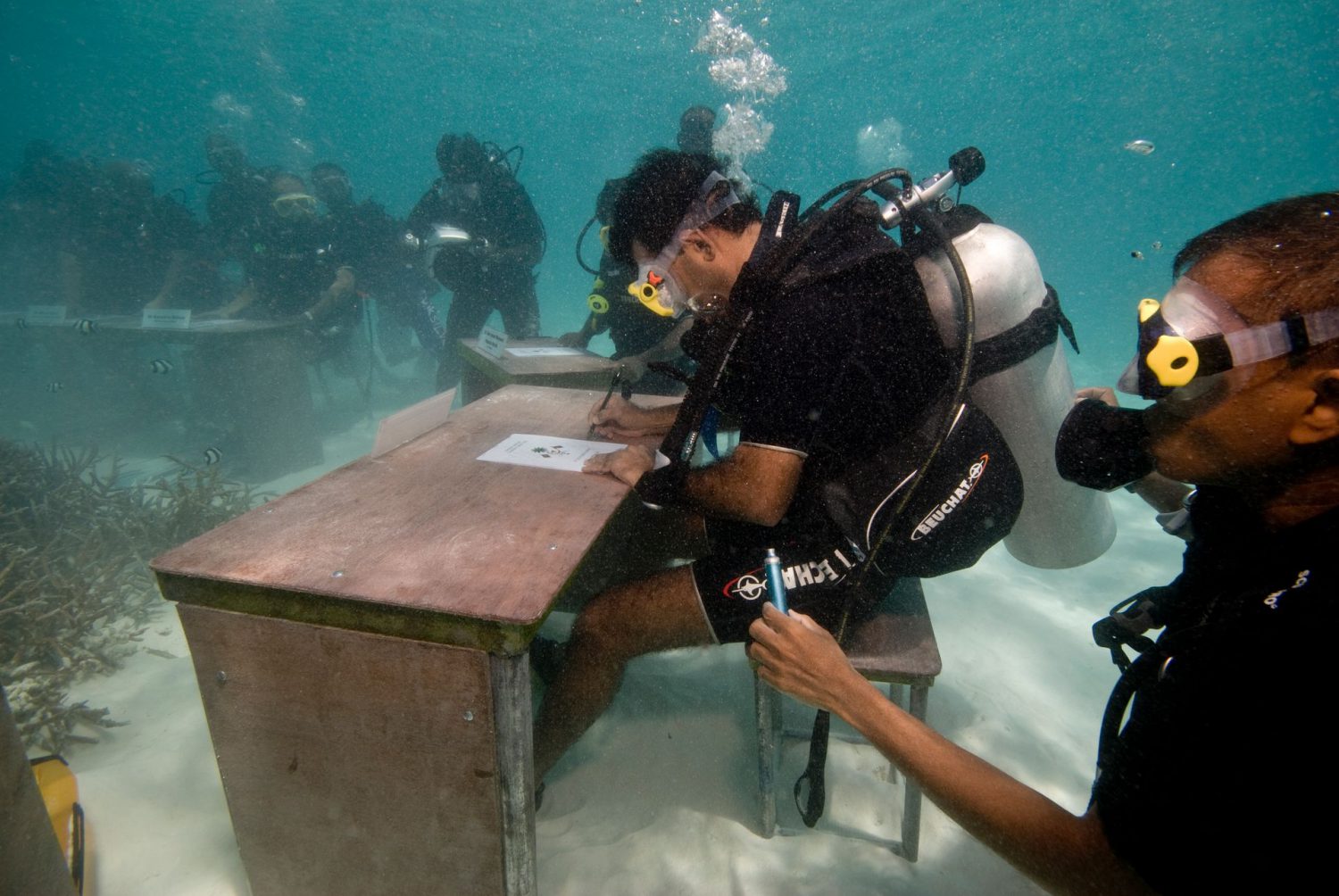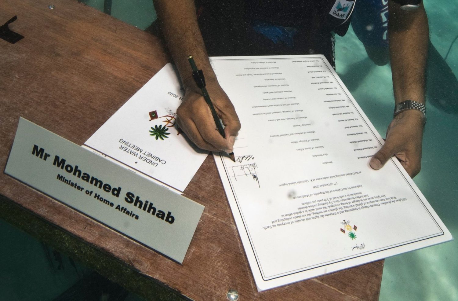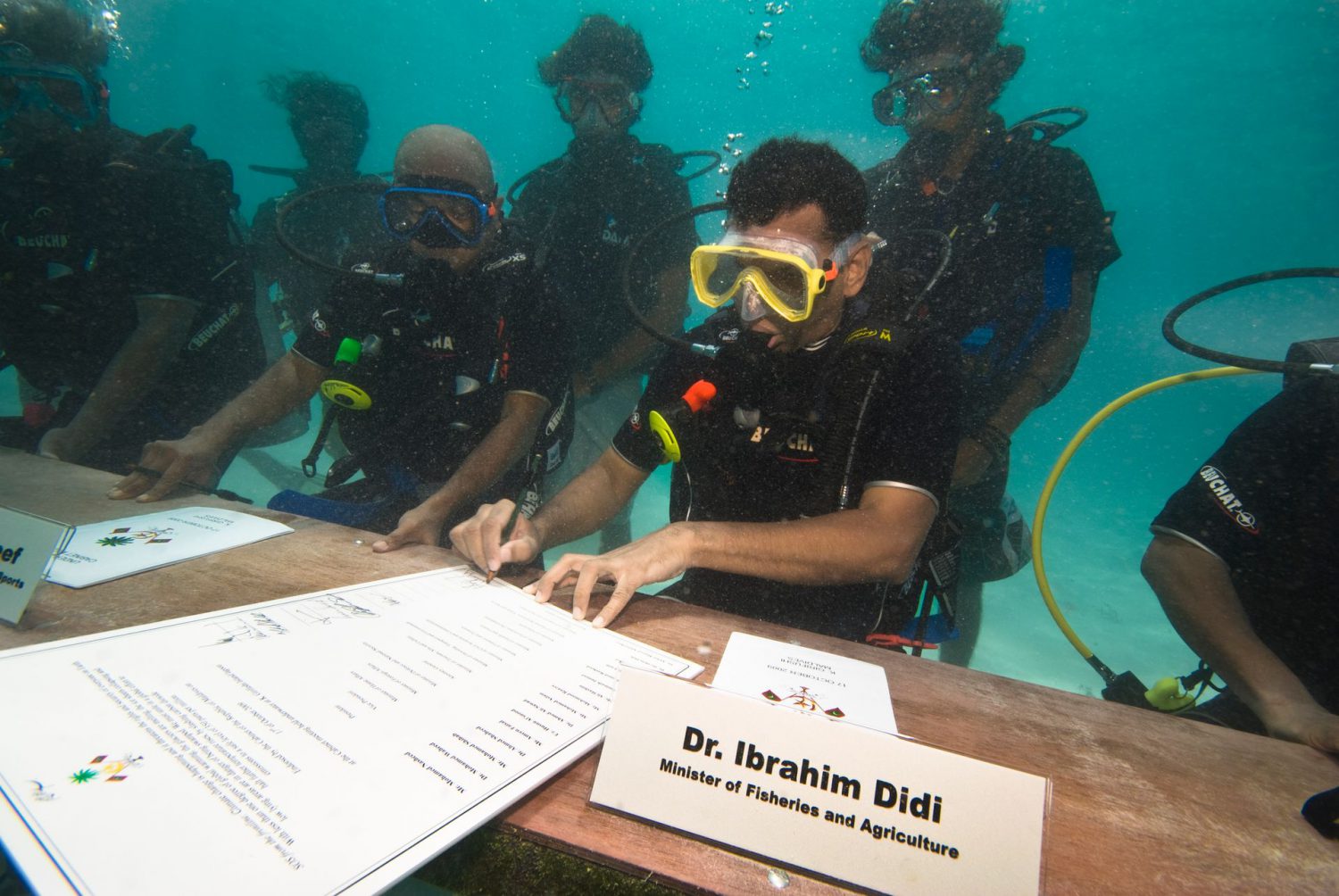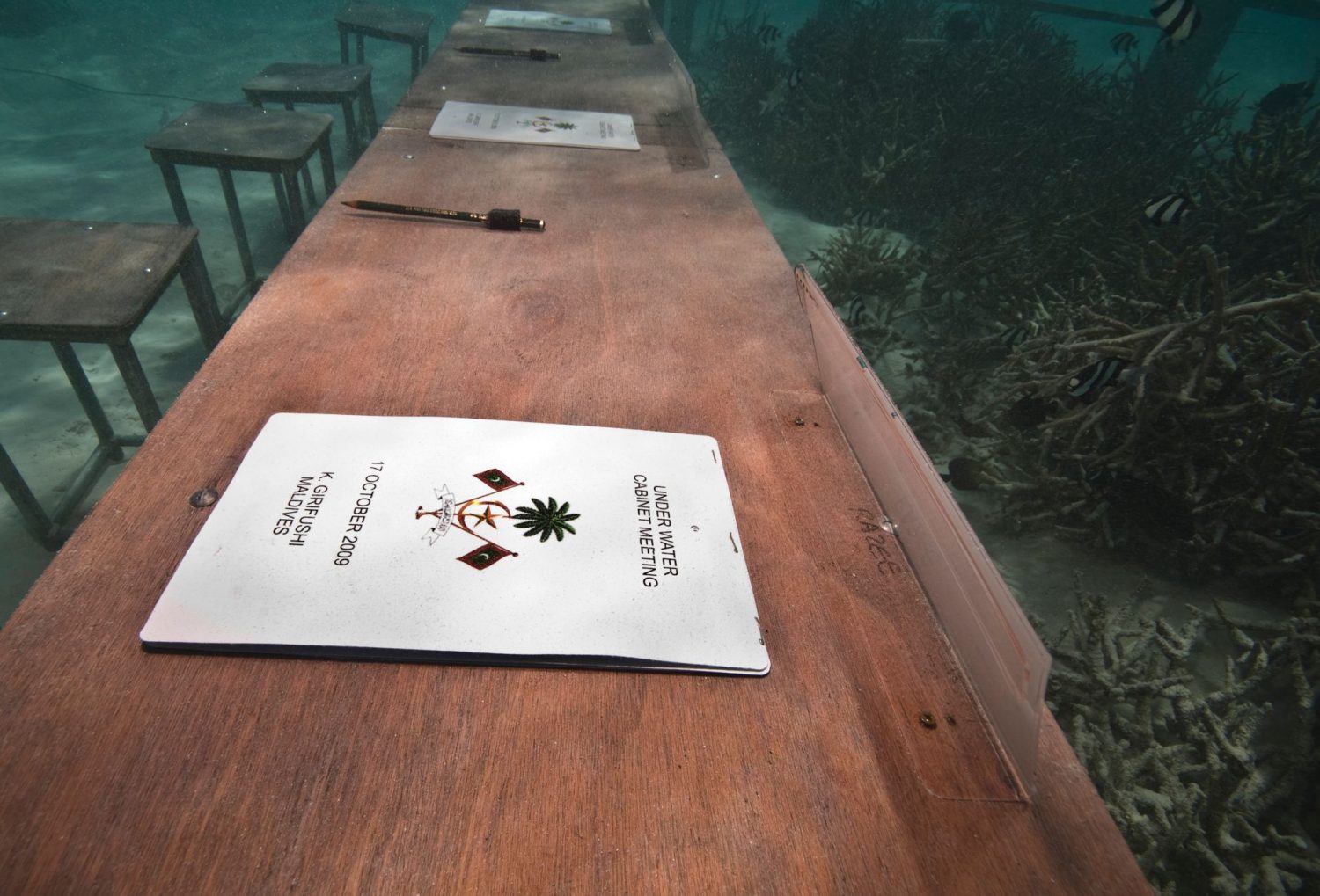 O ministro das Pescas e da Agricultura das Maldivas assina o “SOS climático” aprovado numa reunião subaquática, a 17 de outubro de 2009 MOHAMED SEENEEN / DIVERS ASSOCIATION OF MALDIVESDuas bandeiras das Maldivas sinalizam a realização de um evento oficial MOHAMED SEENEEN / DIVERS ASSOCIATION OF MALDIVESA caminho da reunião, levando em mãos um documento para ser assinado MOHAMED SEENEEN / DIVERS ASSOCIATION OF MALDIVESParticiparam no conselho de ministros subaquático 16 pessoas MOHAMED SEENEEN / DIVERS ASSOCIATION OF MALDIVESMesas, cadeiras e canetas, o essencial para uma reunião fora do comum MOHAMED SEENEEN / DIVERS ASSOCIATION OF MALDIVESO Presidente Mohamed Nasheen foi o grande promotor da iniciativa MOHAMED SEENEEN / DIVERS ASSOCIATION OF MALDIVESA reunião decorreu com recurso a linguagem gestual MOHAMED SEENEEN / DIVERS ASSOCIATION OF MALDIVESO “SOS climático” foi assinado por todos os participantes MOHAMED SEENEEN / DIVERS ASSOCIATION OF MALDIVESA vez do ministro do Interior, Mohamed Shihab MOHAMED SEENEEN / DIVERS ASSOCIATION OF MALDIVESO equipamento de mergulho não atrapalhou os trabalhos MOHAMED SEENEEN / DIVERS ASSOCIATION OF MALDIVESDe regresso à superfície, cumprida a missão MOHAMED SEENEEN / DIVERS ASSOCIATION OF MALDIVES