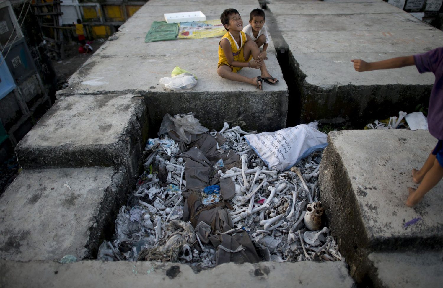 Nas ruas do cemitério, o lixo abunda, misturado com crânios e esqueletos abandonados a céu aberto e roupas rotas de cadáveres exumados ou à espera de serem incinerados.