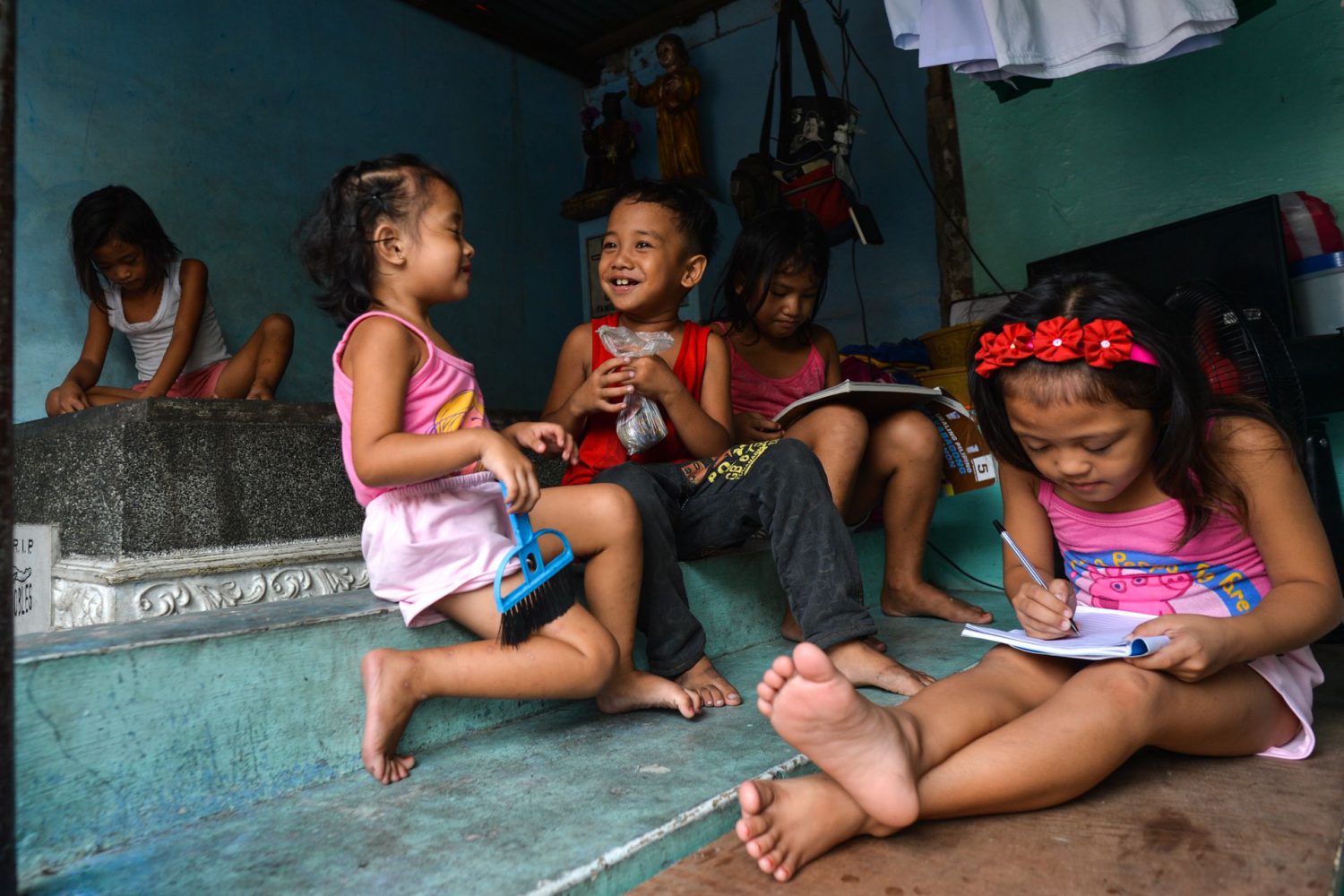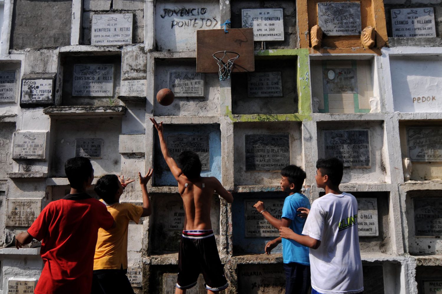 Brincadeiras na água dentro de um mausoléu, num cemitério de Manila MASSIMO RUMI / BARCROFT MEDIA / GETTY IMAGESVida e morte convivem no quotidiano de milhares de filipinos que vivem em cemitérios ARTUR WIDAK / NURPHOTO / GETTY IMAGESCrianças alegres, num triciclo que circula entre jazigos CHERYL RAVELO / REUTERSUm casal apoia-se numa tumba, junto ao seu pequeno negócio ARTUR WIDAK / NURPHOTO / GETTY IMAGESChegada de um funeral, junto a uma casa feita com blocos de cimento e chapas de zinco PAULA BRONSTEIN / GETTY IMAGESNos cemitérios de Manila, não há escolas. A educação das crianças depende de voluntários CHERYL RAVELO / REUTERSHora de diversão dentro do Cemitério do Norte, em Manila EZRA ACAYAN / GETTY IMAGESPartida de basket junto a uma parede com ossários EZRA ACAYAN / NURPHOTO / GETTY IMAGESConcentrados no jogo de bilhar, indiferentes ao que os rodeia NOEL CELIS / AFP / GETTY IMAGESRoupas de moradores num cemitério de Manila MASSIMO RUMI / BARCROFT MEDIA / GETTY IMAGESUma residente põe a roupa a secar junto a um amontoado de jazigos TAKAHIRO YOSHIDA / GETTY IMAGESOssadas humanas num depósito de lixo NOEL CELIS / AFP / GETTY IMAGESQualquer sítio é bom para dormir, mesmo nos dias de maior afluência ao cemitério MOHD SAMSUL MOHD SAID / GETTY IMAGESNo Cemitério do Norte, há vida até no beco mais estreito MASSIMO RUMI / BARCROFT MEDIA / GETTY IMAGESCrisóstomo não perde a fé, ainda que o espaço a que chama casa seja este pequeno cubículo PAULA BRONSTEIN / GETTY IMAGESMural no cemitério público de Navotas, em Manila NOEL CELIS / AFP / GETTY IMAGESAs casas crescem por cima de filas de túmulos EZRA ACAYAN / NURPHOTO / GETTY IMAGESQualquer sítio serve para conviver e tomar-se uma refeição EZRA ACAYAN / NURPHOTO / GETTY IMAGESO conforto possível, no interior de um mausoléu, no Cemitério do Norte PAULA BRONSTEIN / GETTY IMAGESNão há tanque para lavar a roupa. Quanto à água, há que ir buscar ao poço CHERYL RAVELO / REUTERSUma loja de conveniência, dentro do Cemitério do Norte ARTUR WIDAK / NURPHOTO / GETTY IMAGESBasta uma bola e a brincadeira está garantida PAULA BRONSTEIN / GETTY IMAGESJogos de tabuleiro, em cima de um túmulo, no Cemitério de Navotas NOEL CELIS / AFP / GETTY IMAGESSem parques infantis por perto, as crianças dão largas à imaginação possível EZRA ACAYAN / NURPHOTO / GETTY IMAGESUm banho rápido e de água fria, junto a um poço, num cemitério filipino ARTUR WIDAK / NURPHOTO / GETTY IMAGESUma rua coberta de lixo, no Cemitério de Navotas NOEL CELIS / AFP / GETTY IMAGESNo Cemitério do Norte, um grupo de crianças estuda dentro de um mausoléu ARTUR WIDAK / NURPHOTO / GETTY IMAGESTratando-se de crianças, nada dentro do cemitério fica por percorrer EZRA ACAYAN / NURPHOTO / GETTY IMAGESEsta família goza de alguma privacidade, dentro de um mausoléu JOHN JAVELLANA / REUTERSNa falta de escorregas, as crianças improvisam EZRA ACAYAN / NURPHOTO / GETTY IMAGESUm cemitério que mais parece um bairro de lata NOEL CELIS / AFP / GETTY IMAGESO colchão é uma chapa de zinco ondulada DONDI TAWATAO / GETTY IMAGESHá quem nasça nos cemitérios de Manila EZRA ACAYAN / NURPHOTO / GETTY IMAGESApesar de não haver serviço de eletricidade no cemitério, não faltam televisões ROMEO RANOCO / REUTERSA curiosidade de quem vive no cemitério perante o ritual de quem visita a campa de um familiar EZRA ACAYAN / NURPHOTO / GETTY IMAGES