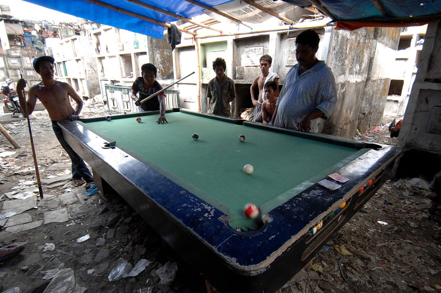 A qualquer hora do dia, há colchões estendidos em cima de tumbas de mármore onde alguém dormita. Dentro de mausoléus, vê-se televisão com eletricidade desviada da rede pública. Os jazigos servem de mesa de refeições ou de tampo para jogos de tabuleiro, da preferência dos mais velhos. Os mais jovens jogam basquetebol nas ruas com cestos afixados em paredes com ossários. E há sempre alguém que toma banho ao ar livre, com água do balde tirada de um poço.