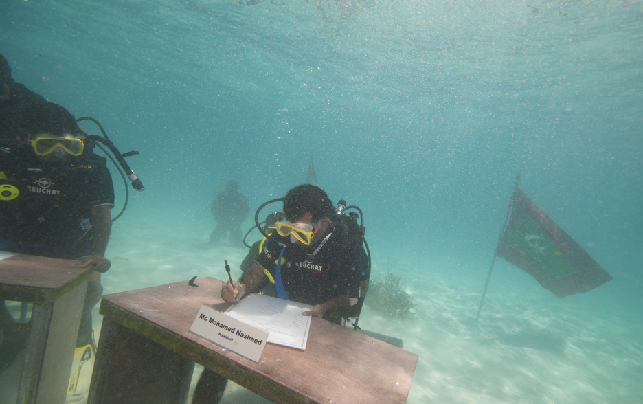 A iniciativa foi simultaneamente um alerta para o mundo e um pedido de ajuda: a manter-se o aquecimento global e o consequente degelo dos graciares, as Maldivas — cujo ponto mais alto é inferior a dois metros — vão afundar-se no meio do oceano.