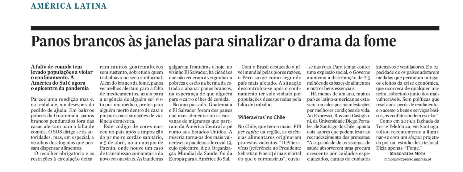 Há menos de um ano, muitos países latino-americanos estavam tomados por manifestações por melhores condições de vida. Ao Expresso, Rossana Castiglioni, da Universidade Diego Portales, de Santiago do Chile, aponta dois fatores que podem levar ao recrudescimento dos protestos: “A capacidade de os sistemas de saúde absorverem uma procura crescente por cuidados especializados, camas de cuidados intensivos e ventiladores. E a capacidade de os países adotarem medidas que permitam mitigar os efeitos da crise económica, que ocorrerá de qualquer maneira, sobretudo junto dos mais vulneráveis. Sem políticas que resolvam a perda de rendimentos e o acesso a bens e serviços básicos, os conflitos podem escalar.”