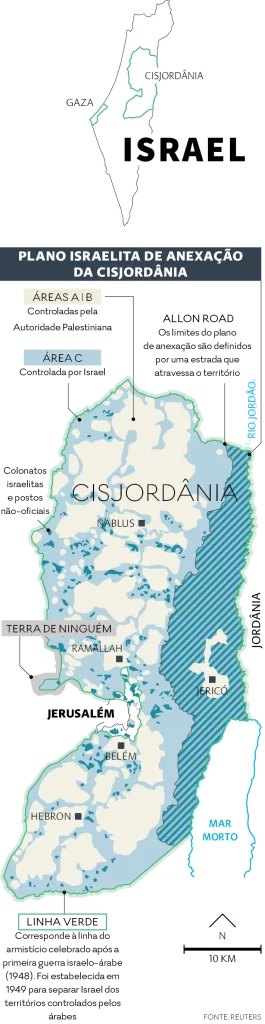 Se o plano de Netanyahu for avante, será a primeira anexação de território palestiniano desde 1967, quando Israel conquistou e anexou unilateralmente Jerusalém Oriental, a parte árabe da cidade santa para judeus, cristãos e muçulmanos, que israelitas e palestinianos querem para capital. Na prática, Israel estenderá o seu ordenamento jurídico civil a terras que já ocupa e onde agora aplica leis militares.