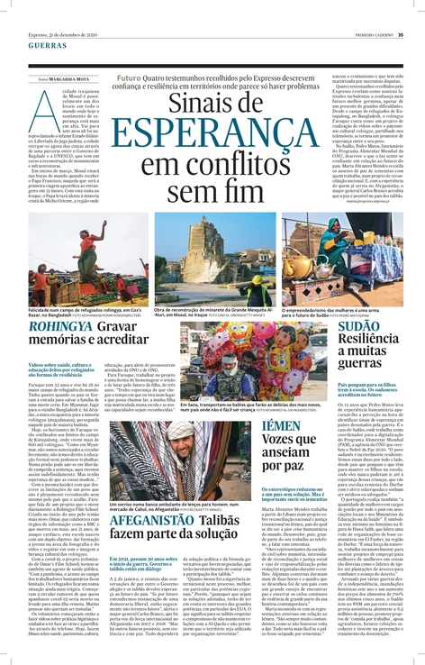 No Sudão, Pedro Matos, funcionário do Programa Alimentar Mundial da ONU, descreve o que o faz sentir-se confiante em relação ao futuro do país. Marta Abrantes Mendes recorda os anseios de paz de iemenitas com quem trabalha, num projeto de reconciliação nacional. E, com a experiência de quem já serviu no Afeganistão, o major-general Carlos Branco acredita que a paz é possível no país dos talibãs.