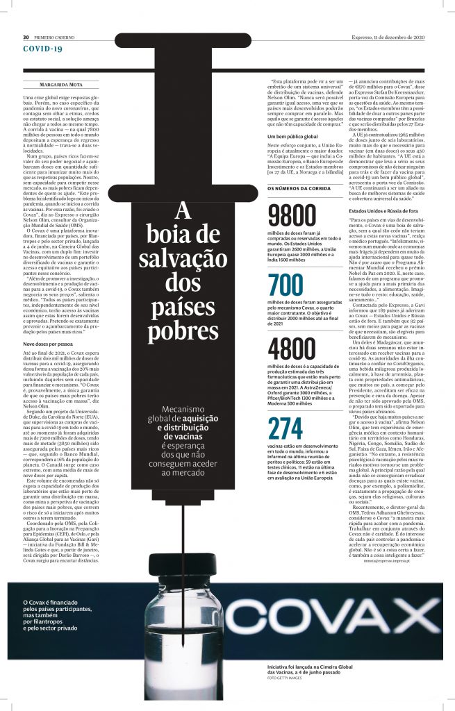 Até ao final de 2021, o Covax espera distribuir dois mil milhões de doses de vacinas para a covid-19, assegurando dessa forma a vacinação dos 20% mais vulneráveis da população de cada país, incluindo daqueles sem capacidade para financiar o mecanismo. “O Covax é, provavelmente, a única garantia de que os países mais pobres terão acesso à vacinação em massa”, diz Nelson Olim.