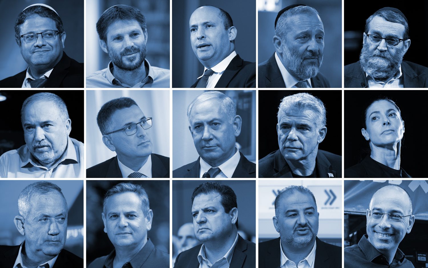 Líderes partidários nas eleições de 23 de março de 2021. De cima para baixo e da esquerda para a direita: Itamar Ben Gvir (do Otzma Yehudit, que integra o Sionismo Religioso); Bezalel Smotrich (Sionismo Religioso); Naftali Bennett (Yamina); Aryeh Deri (Shas); Moshe Gafni (Judaísmoda Torá Unida); Avigdor Liberman (Yisrael Beytenu); Gideon Sa’ar (Nova Esperança); Benjamin Netanyahu (Likud); Yair Lapid (Yesh Atid); Merav Michaeli (Partido Trabalhista); Benny Gantz (Azul e Branco); Nitzan Horowitz (Meretz); Ayman Odeh (Lista Conjunta); Mansour Abbas (Ra’am); Yaron Zelekha (Nova Economia) MONTAGEM FOTOGRÁFICA PUBLICADA NO THE TIMES OF ISRAEL