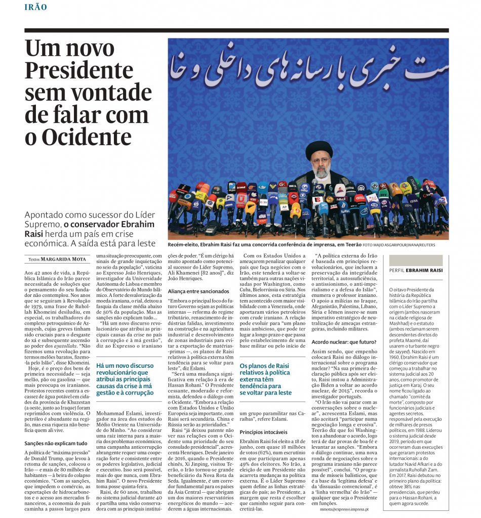 Ebrahim Raisi foi eleito a 18 de junho, com quase 18 milhões de votos (62%), num escrutínio em que participaram apenas 49% dos eleitores. No Irão, a eleição de um Presidente não acarreta mudanças na política externa. É o Líder Supremo quem define as linhas estratégicas do país; ao Presidente, a margem que resta é escolher que caminho seguir para concretizá-las.