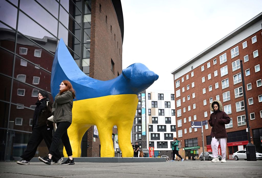 Por estes dias, a “superlambanana”, uma icónica escultura de Liverpool, ganhou as cores da Ucrânia PAUL ELLIS / AFP / GETTY IMAGES