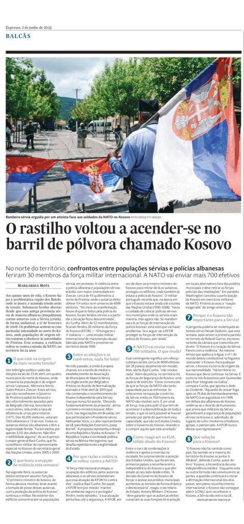 Aos quinze anos de vida, o Kosovo faz jus à problemática região dos Balcãs, onde se insere, e acumula tensão atrás de tensão. Subsistem feridas abertas desde que esta antiga província sérvia de maioria albanesa (muçulmana) cortou amarras com a Sérvia (cristã), de forma unilateral, a 17 de fevereiro de 2008. Os problemas sentem-se com particular intensidade no norte do Kosovo, onde populações de origem sérvia resistem a obedecer às autoridades de Pristina. Esta semana, a violência voltou-se contra a missão da NATO, no território há 24 anos.
