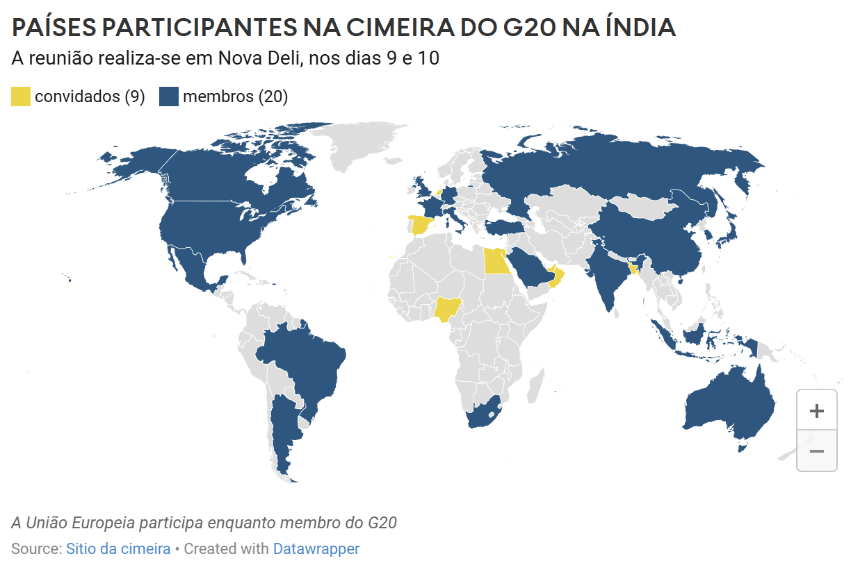 Em Nova Deli, para além dos 20 membros, estarão também nove países convidados: dois europeus (Espanha e Países Baixos), um da África Subsariana (Nigéria), três países árabes (Egito, Emirados Árabes Unidos e Omã), dois asiáticos (Bangladesh e Singapura) e um insular (Maurícias).