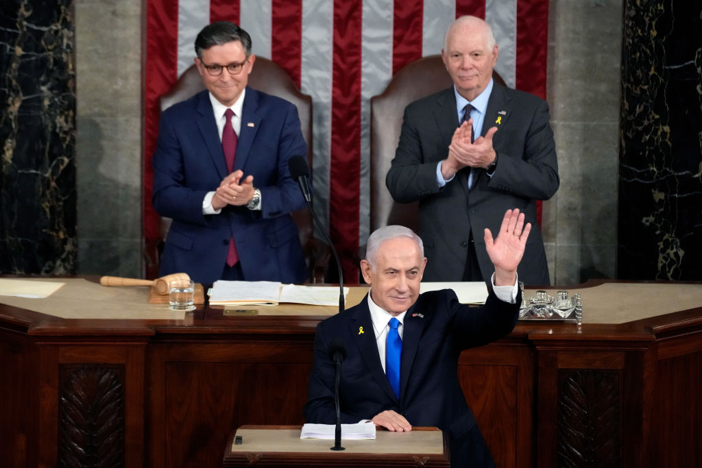 Não foi só fora do edifício do Capitólio que a presença de Netanyahu gerou contestação. No interior, enquanto ele discursava, a democrata Rashida Tlaib, membro da Câmara dos Representantes de ascendência palestiniana, levantou uma placa em que se lia: “criminoso de guerra” e “culpado de genocídio”.