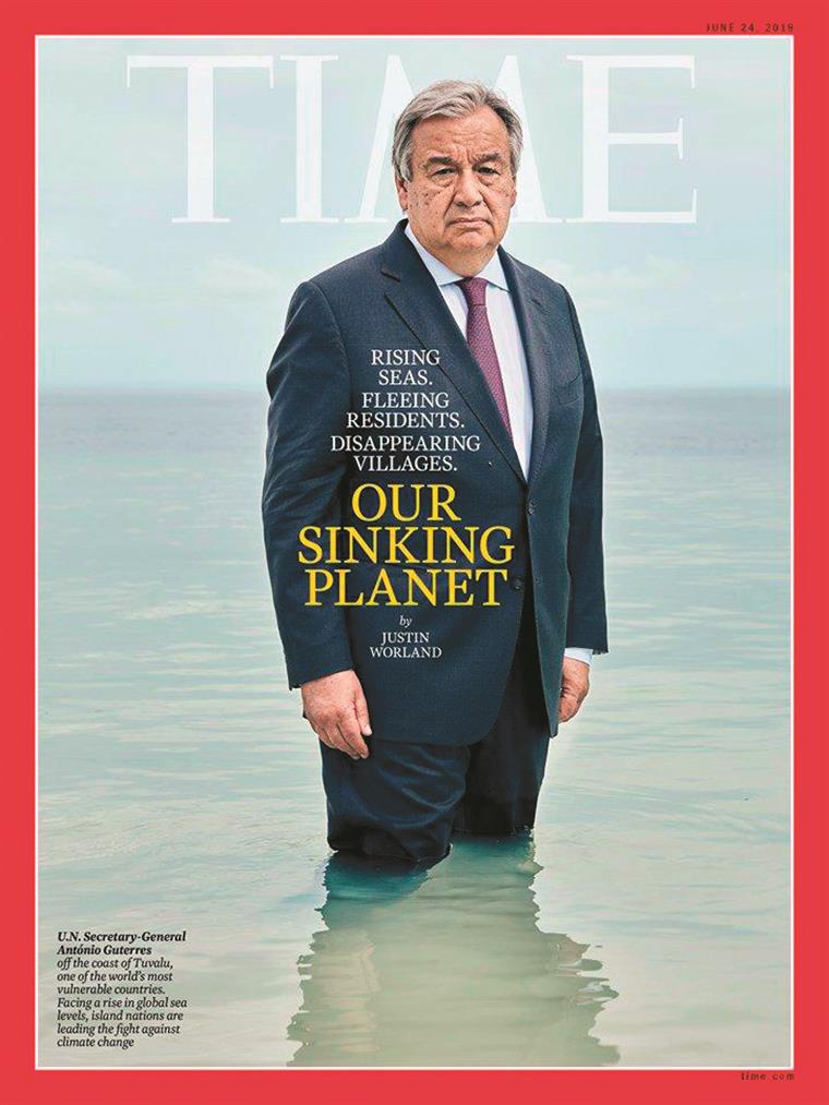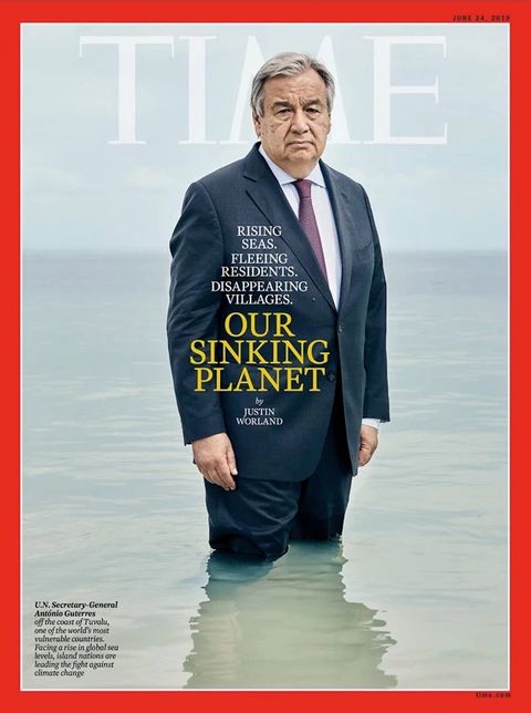 A fotografia que ilustra a capa da “Time” foi tirada precisamente em Tuvalu. Com a água do Pacífico pelos joelhos, e uma expressão séria, Guterres surge na posição de um vulgar cidadão daquele país que vê, diariamente, o mar cada vez mais perto de lhe entrar casa adentro.