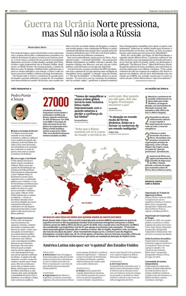 Na agenda de trabalhos da cimeira, figuraram conversações sobre “a guerra de agressão da Rússia contra a Ucrânia” e sobre o “Médio Oriente”. “A informação europeia continua a ser, muitas vezes, infeliz. Na reunião de hoje, a delegação europeia nem sequer consegue classificar o Médio Oriente como conflito”, realça o docente. “Este tipo de dinâmicas é importantíssimo para os russos. Leva-os a dizer: ‘Estão a ver? Para estes senhores, há conflitos de primeira e conflitos de segunda.”