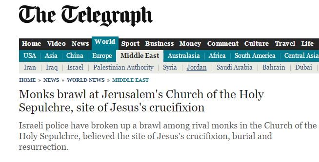 O templo construído sobre os lugares que simbolizam a crucificação, o túmulo e a ressurreição de Jesus é um dos locais mais sensíveis à face da Terra. Dentro do Santo Sepulcro, vivem em permanência monges de diferentes ritos cristãos. A sã convivência entre todos depende do cumprimento de um conjunto de regras estabelecidas no século XIX e ao zelo de duas famílias muçulmanas